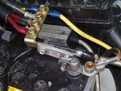 バッテリー−端子とアーシングケーブルターミナルの間にアーシングチップを挟んで装着、オーディオの音が良く